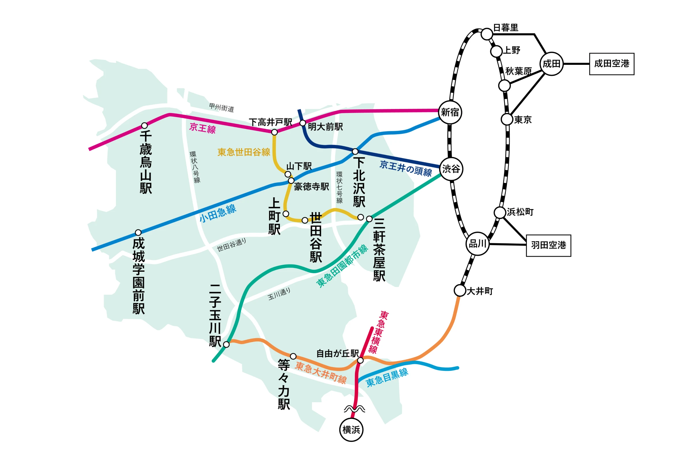 鉄道7路線が走り、東西に国道246号線・世田谷通り・甲州街道、南北に環状七号線(通称"カンナナ")・環状八号線(通称"カンパチ")が通っています。